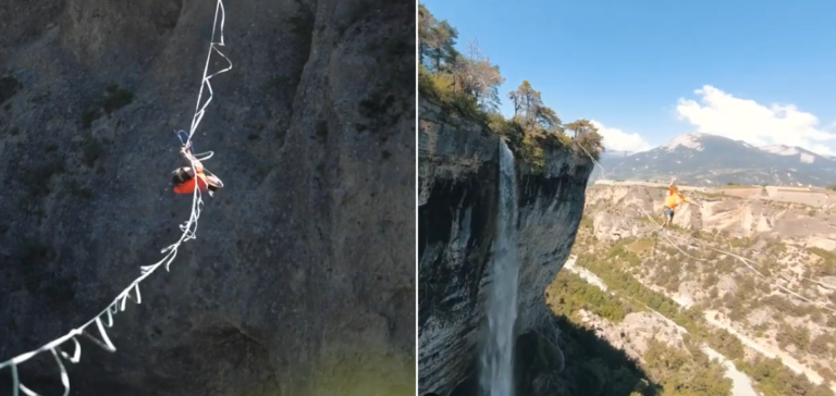 Pendant que certains essayent simplement de traverser 10 mètres sur une slackline tendue à un mètre du sol (nous les premiers !), d’autres préfèrent prendre de la hauteur à l’image du Français Pablo Signoret, un des meilleurs highliners au monde. Après avoir battu le record du monde de la discipline avec une highline de 1662 mètres au-dessus du cirque de Navacelles (voir plus bas), il s’amuse ici avec le drone du réalisateur Robin Crétinon.