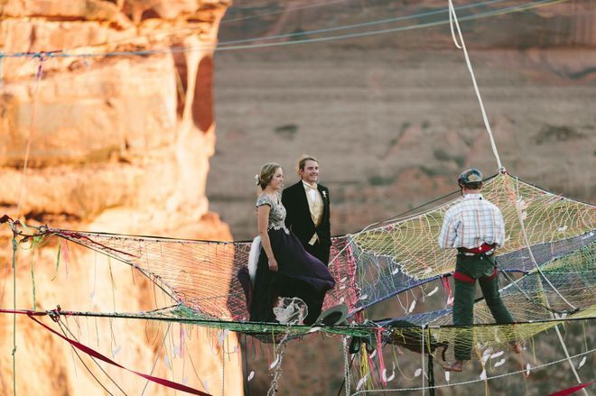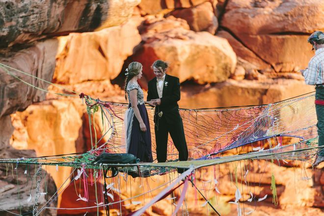 Situé dans le Parc national de Canyonlands (Moab, Utah), ce lieu était parfait pour installer cette toile d’araignée sur laquelle le prêtre a pu célébrer l’acte du mariage. Les tourtereaux ont fait le grand saut, dans tous les sens du terme !