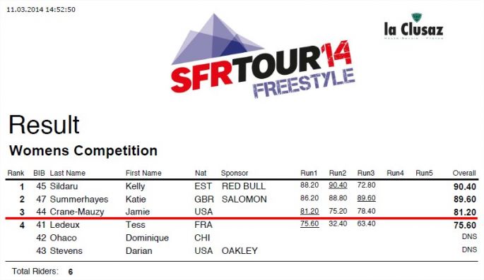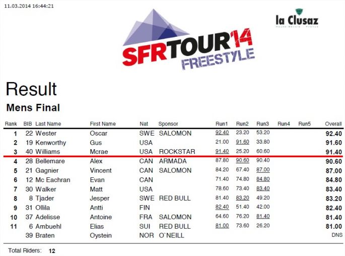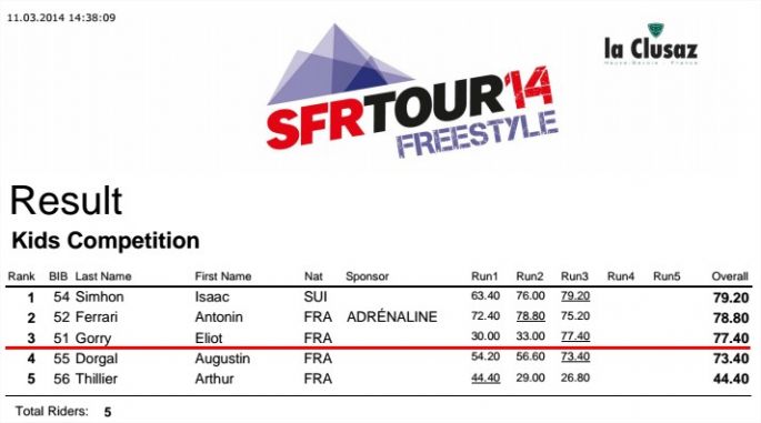 The Rider Post | 12 mars 2014 SFR FREESTYLE TOUR – OSCAR WESTER ROI À LA CLUSAZ ski Snow Depuis l’arrêt des X Games en Europe, le SFR Freestyle Tour monte sacrément en puissance et hier il y a eu du lourd dans le portillon de départ à La Clusaz pour la dernière manche slopestyle ! Pour faire face au manque de neige au bas de la station, les organisateurs ont réussi à construire un parcours tout neuf en seulement une semaine. De cette finale classée Platinum au classement AFP, il faut forcément retenir la performance inouïe d'Oscar Wester (92,40 pts) ! Auteur notamment d'un nose butter double cork 12 japan et d'un switch unnat double cork, le Suédois, leader à l'overall, s'impose haut la main devant le vice champion olympique Gus Kenwothy et l'Américain McRae Williams. A part ça, encourageante neuvième place du Français Antoine Adelisse ! De son côté, l'indétrônable Kelly Sildaru (90,4 pts) se hisse pour la troisième fois sur la première marche du podium . Grâce à sa technique (switch 1000), la jeune estonienne devance la Britannique Katie Summerhayes et l'Américaine Jamie Crane-Mauzy. Enfin chez les kids, Isaac Simhon l'emporte scorant à 79,20 points (nose butter cork 10, cork 10 liu kang) devant deux Plagnards Antonin Ferrari et Eliot Gorry. Rendez-vous dans le pipe tignard la semaine prochaine pour l'utime étape de la tournée mondiale. CoralieL