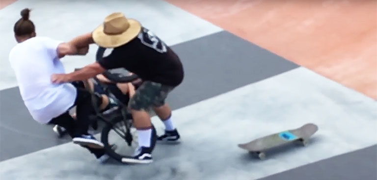 Dans un park, la cohabitation se passe assez bien en général, surtout entre le skate et le bmx qui se respectent plutôt bien. Sauf que ce jour-là, un petit skater de 12 ans était au mauvais endroit au mauvais moment. Et que son papa était devant et qu’il est assez balaise…