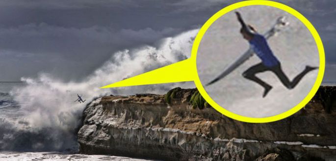 The Rider Post | 15 octobre 2013 UN SURFEUR DEFIE LA MORT EN SAUTANT ! insolite Lifestyle Connus parfois pour le rythme de vie un peu "borderline", certains surfeurs n'ont pas la ponctualité dans la peau. La preuve avec ce moment incroyable d'un rideur, planche à la main, sautant d'une falaise immense. Immortalisée par Allen Hughes, un graphiste et photographe amateur, la scène a de quoi couper le souffle ! Sans doute anxieux d'être en retard pour son heat lors d'une compétition, ce sportif inconnu un chouya "crazy" a décidé de défier la mort en se jetant du Lighthouse Point à Santa Cruz, un célèbre spot californien où Jack O'Neill a notamment développé la combinaison moderne. Comme vous pouvez le voir sur la photo, ce timbré effectue un jump phénoménal de neuf mètres dans une mer déchaînée. Une solution plutôt dingo pour gagner du temps mais pas très étonnant de la part d'un rider. CoralieL