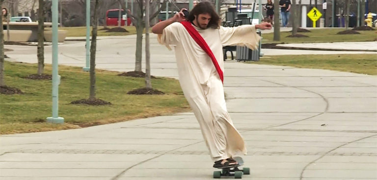 The Rider Post | 22 mars 2017 Scoop : Jesus est un longboardeur ! LONGBOARD SKATE Urban Après deux bons millénaires d’absence, Jesus Christ est de retour et il se déplace en skateboard ! Joe Gerin est étudiant à l’université de Akron dans l’Ohio et vu son look (cheveux longs et barbe), son costume était tout trouvé. Aujourd’hui il se fait appeler modestement « Longboard Jesus« . Notre skateur a troqué ses Vans contre des mythiques sandales et a enfilé sa robe pour une session de dancing sur le campus. Âgé de 20 ans, ce Jesus des temps modernes tape le show quotidiennement pour le bonheur des passants et autres étudiants, même si son niveau en skate est loin d’être « divin »…