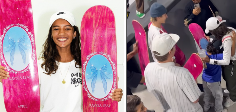 Médaillée d’argent des derniers Jeux Olympiques de Tokyo, Rayssa Leal possède désormais le statut de rideuse pro chez April. La jeune Brésilienne de 14 ans a en effet eu la bonne surprise de découvrir une planche à son nom lors de son arrivée au skatepark il y a quelques jours. Riding Zone vous avait fait découvrir cette jeune rideuse en 2019 dans un reportage (à revoir en bas de l’article). On n’a pas fini de voir la Brésilienne sur les podiums de la SLS et des différents contests à travers le monde.