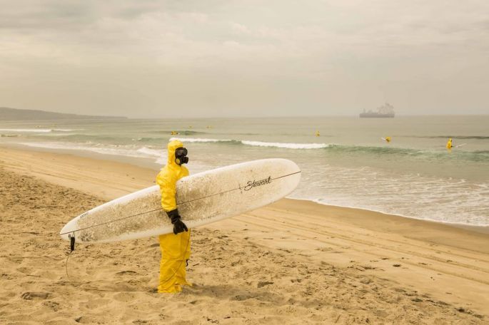 The Rider Post | 24 août 2015 « Hamzat Surfing », quand l’océan se transforme en poison SURF Water Alors qu'il part voir un ami en Californie en 2014, le photographe Michael Dyrland n'a qu'une hâte, aller surfer à Venice Beach ! Le problème, c'est qu'il a plu toute la soirée… Le lendemain, lorsqu’il demande à son ami quand ils iront à l'eau, ce dernier lui répond qu'il est fou, qu'il n'est pas question de mettre un pied dans l'eau ! La raison est simple, l'eau est tellement polluée qu'ils pourraient attraper le MRSA (Staphylococcus aureus résistant à la méticilline), l'hépatite C ou encore des infections respiratoires ou des virus…Enfin rien de bien sympa quoi ! Plus tard Dyrland écrira sur le site internet Bored Panda, "J'étais choqué parce qu'il pleut tellement à LA. Toutes les eaux usées, les ordures, les huiles et les matière fécales coulent tout droit des rues jusqu'au sable, puis dans l'océan". Accablé par cette découverte, il décide de se servir de cette vérité pour mettre en scène une série de photos. Munis de combinaisons (mais cette fois ci pas pour surfer) et de masques à gaz ils ont bravé le danger pour dénoncer ce fléau et sensibiliser les surfeurs. Après les récentes contaminations de l'eau au Colorado qui ont empêché les activités nautiques et la pêche, la question de la pollution de l'eau et de l'action de l'homme est plus qu'urgente. Photos by Michael Dyrland & Mike Marshall MV