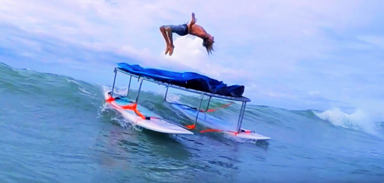 The Rider Post | 14 octobre 2016 L’invention ultime : le trampoline-surf ! Autres water insolite SURF Water Le trampoline, c’est cool et le surf, c’est cool aussi donc imaginez ces deux sports enfin réunis ! La bande de Jack Tenney sait comment s’amuser et prendre du bon temps. Ils ont pensé que ce concept insolite pourrait fonctionner et effectivement, c’est une réussite. Surfer sur des vagues, debout sur un trampoline et rebondir en même temps, voilà une idée ingénieuse et fun à tout point de vue ! Et juste avant que l’ouragan Matthew viennent s’abattre et tout fracasser sur la côte Est des États-Unis, nos joyeux lurons ont profité de ces forts courants pour une session unique portés par ces vents violents. Une joyeuse partie de rigolade sur ces vagues floridiennes avec une invention riche en rebondissements !