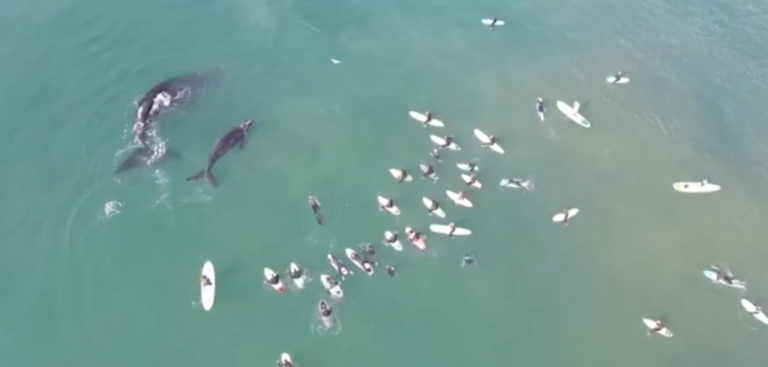 La scène a été capturée par le drone de Dominique Taylor le 2 août dernier au large de la plage de Manly près de Sydney. On y voit plusieurs dizaines de surfeurs venir admirer une baleine et son baleineau. Les deux mammifères marins sont restés plusieurs minutes près des surfeurs avant de reprendre le large.