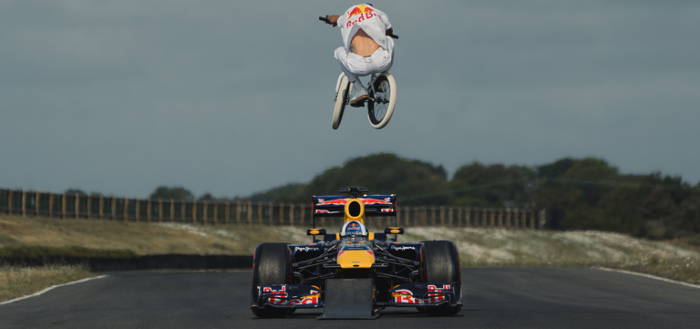 Il fallait être précis pour le rider BMX afin d’éviter la F1 pilotée par David Coulthard. Pari réussi pour Kriss Kyle. C’est face à la Formule 1 de David Coulthard (en mouvement évidemment) que Kriss Kyle s’est lancé le pari de sauter au-dessus de la monoplace. Il a fallu de multiples essais …