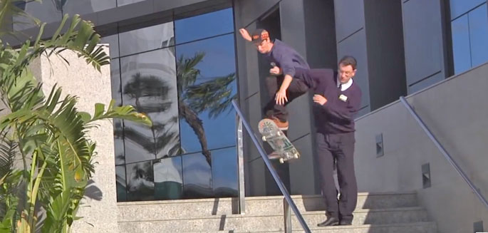 The Rider Post | 20 avril 2015 Paul Hart tombe dans les escaliers, stoppé par un agent de sécurité SKATE Urban Les agents de sécurité et les skateurs ne se sont jamais très bien entendus. C’est souvent la course pour taper son tricks avant que les agents se pointent. Et quand ils sont là, ils faut se barrer en courant ou essayer de leur tenir tête si vous êtes avec quelques potes. Alors qu’il allait lancer un backside lipslide sur un rail, Paul Hart a été bousculé par un agent de sécurité qui l'a empêché de faire son tricks. Résultat, le rider est tombé dans les escaliers, mais cela ne l’a pas empêché de replaquer un beau slide une fois l’agent parti. La suite en vidéo ! Arthur L.