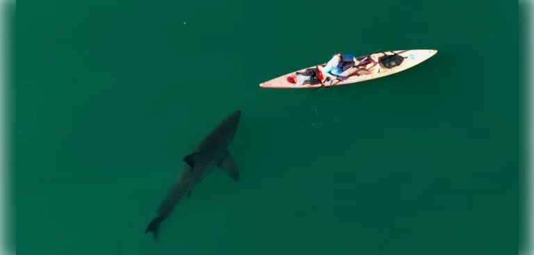 La scène a été filmée par Carlos Gauna, un réalisateur qui utilise son drone pour filmer les dauphins et requins qui passent près des côtes californiennes. Ce jour-là, alors que son amie Samantha est au large avec son kayak, Carlos finit par repérer avec son drone un requin qui se rapproche progressivement de l’embarcation. Les requins sont des créatures naturellement curieuses qui préfèrent inspecter leurs proies potentielles par derrière, et ce comportement est clairement visible dans la vidéo. Lorsque Gauna a repéré le grand requin blanc, il a prévenu son amie Samantha par radio. « L’animal mesurait environ 3,6 mètres de long » estime Gauna. Découvrez la scène en vidéo ci-dessous ainsi que le moment où Gauna lui-même est allé à l’eau avec son kayak, à la rencontre d’un autre grand requin blanc.