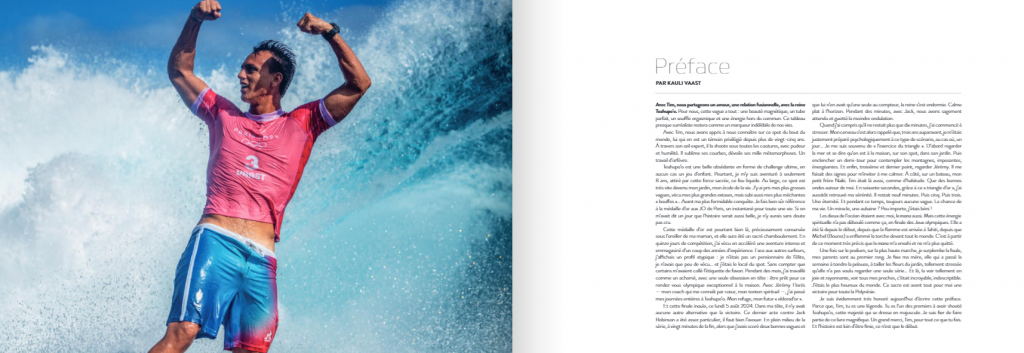Outre les textes de l’écrivaine Ingrid Astier, de Guillaume Dufau ou des journalistes David Michel et Nick Carroll, on retrouve aussi la plume de Kauli Vaast qui signe lui aussi l’une des préfaces du livre. Le local possède également une histoire particulière avec cette vague, qu’il a surfée pour la première fois à l’âge de 8 ans et sur laquelle il a décroché sa plus belle victoire lors des JO de Paris 2024. « Au large, ce spot est très vite devenu mon jardin, mon école de la vie. […] Avec Tim, nous avons appris à nous connaître sur ce spot du bout du monde, lui qui en est un témoin privilégié depuis plus de vingt-cinq ans. À travers son œil expert, il al shoote sous toutes les coutures, avec pudeur et humilité. Il sublime ses courbes, dévoile ses mille métamorphoses. Un travail d’orfèvre. »